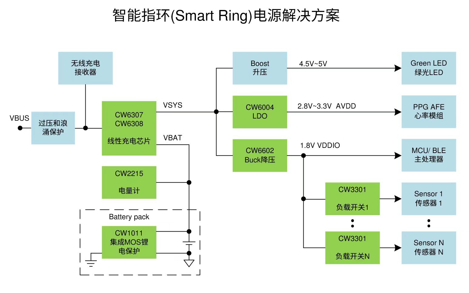 賽微微電智能指環(huán)解決方案主打超低功耗、超小尺寸,包含0.5uA超低功耗且?guī)窂焦芾淼木€充芯片CW6307/CW6308、300nA Iq的Buck轉(zhuǎn)換器CW6602、300nA Iq的LDO CW6004以及5nA Iq的負載開關(guān)CW3301等;同時,該方案還包括微安級工作電流的電量計CW2215和集成MOS的單節(jié)鋰電保護CW1011。該電源方案可助力實現(xiàn)智能指環(huán)的超小空間堆疊和更長時間續(xù)航。