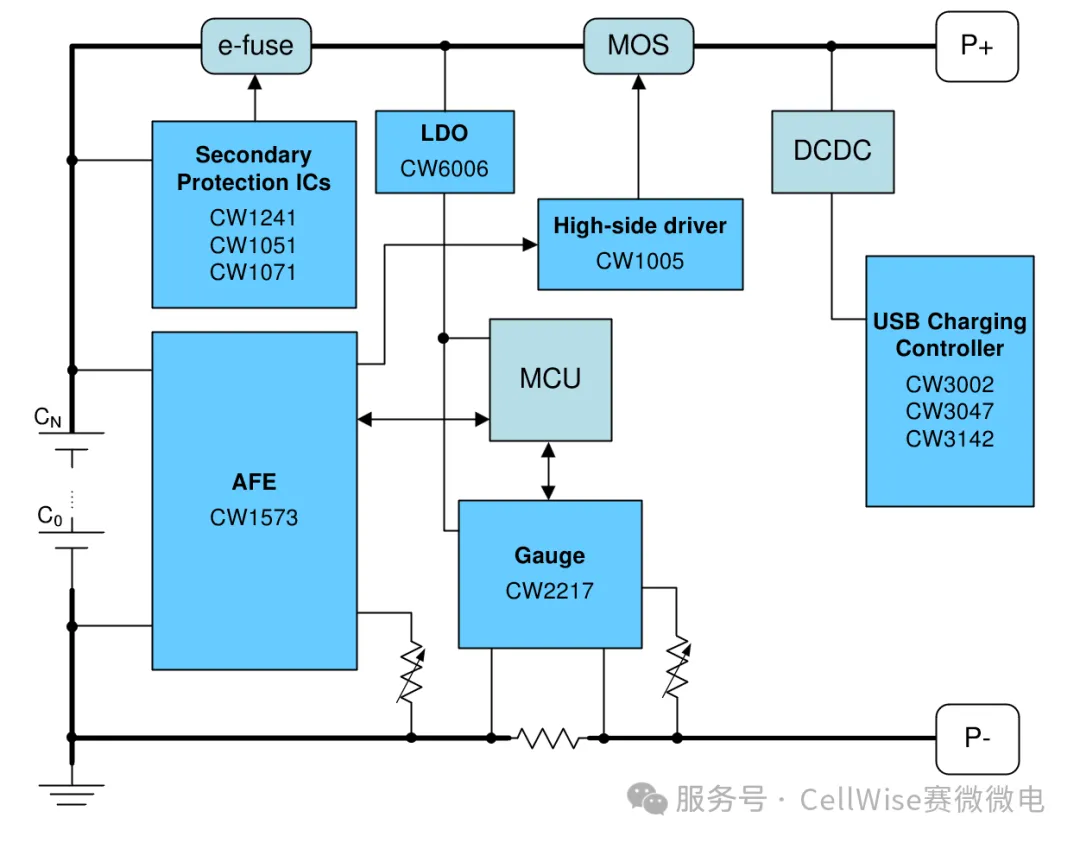 CW1573是一款高精度的模擬前端芯片(AFE),適用于3~7串鋰電池、磷酸鐵鋰電池、鋰聚合物以及鈉離子電池。芯片內(nèi)置16bit ADC,可為電池包提供高精度的電壓(±10mV)、電流和溫度(±1℃)采樣。該產(chǎn)品集成了硬件保護(hù)功能,包括過充電、過放電、過電流、短路以及溫度保護(hù),相關(guān)參數(shù)可靈活設(shè)置,確保電池包的使用安全。